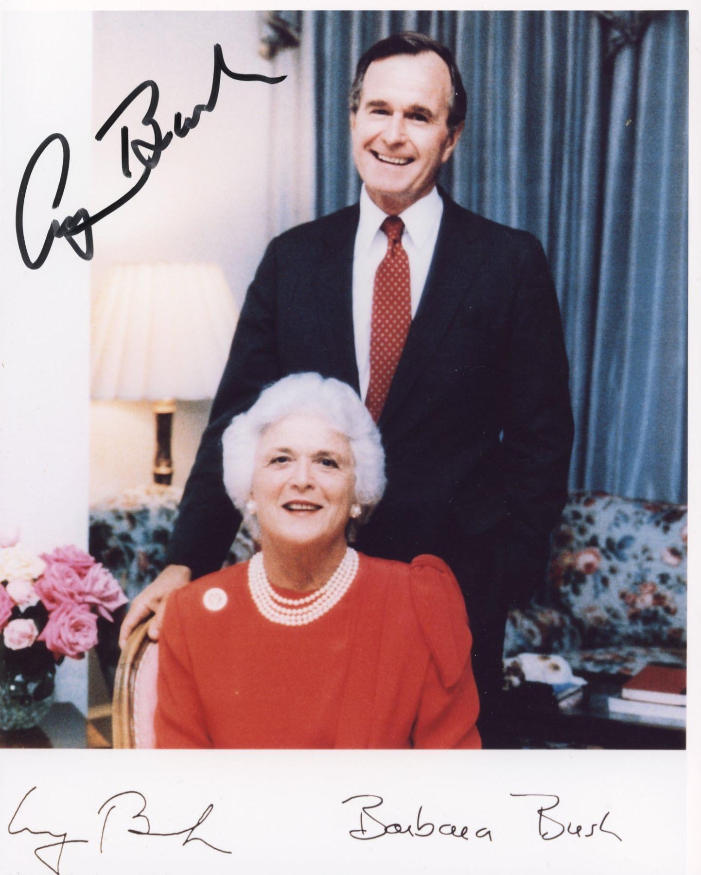 George Bush signed White House photo. The bottom of this is a facsimile signed first couple photo but George Bush signed the upper left in person. 8x10 inches. This item was signed at The Hollywood Show in Burbank, CA