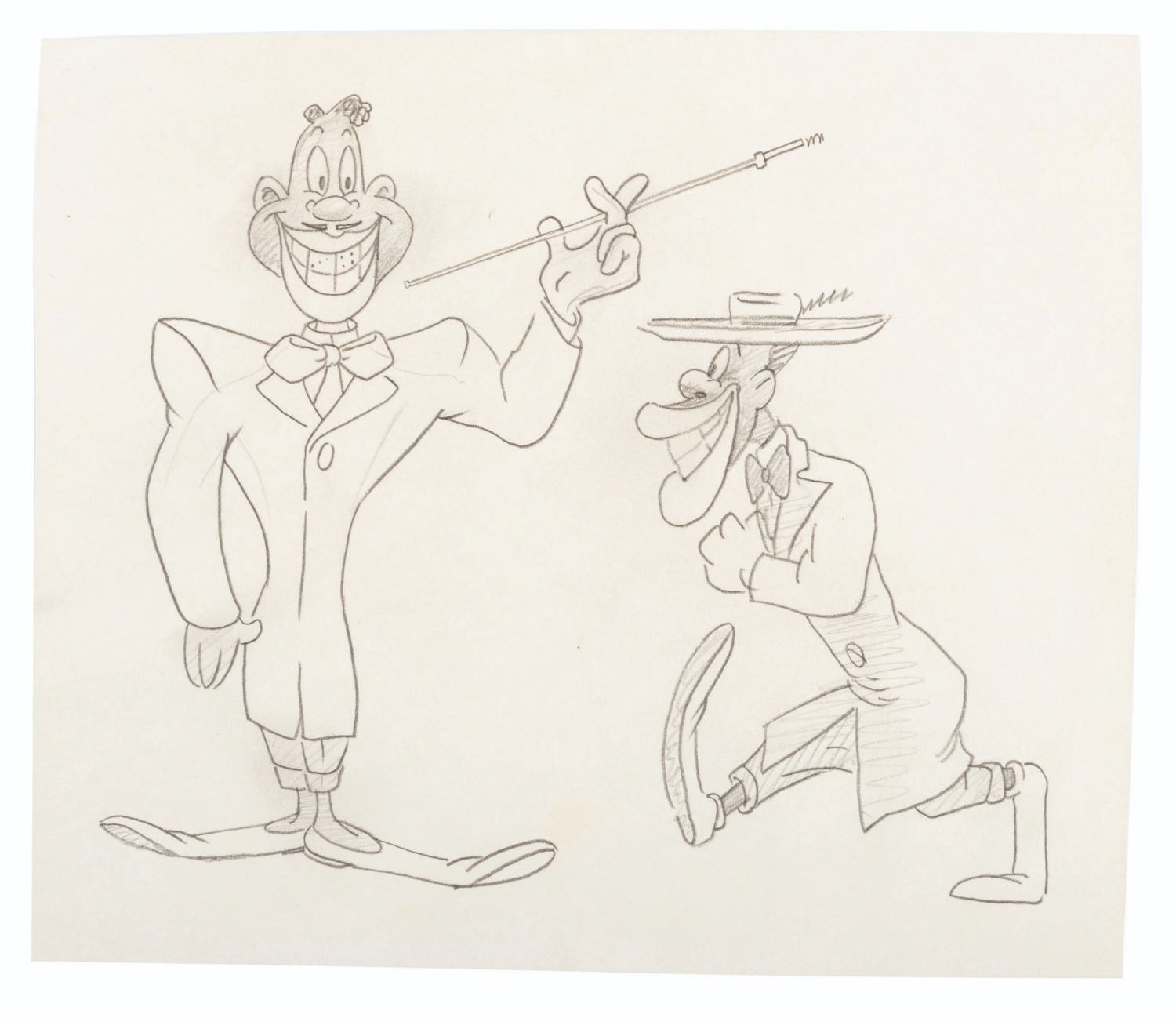 (Schlesinger, 1943) A drawing with two character development studies of Prince Chawmin’ from "Coal Black and de Sebben Dwarfs.” With an overall image size of 5.5” x 6.5” on 6.5” x 7.75” paper, the art is in very good condition with pinholes at the corners from display, intentional smudging to one figure, and typical light wear from age.
