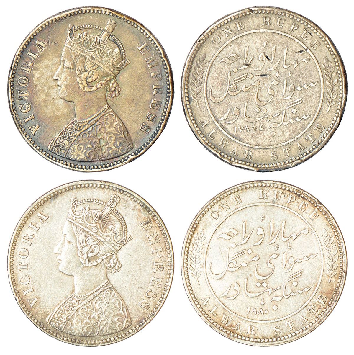 Princely States: Alwar, Mangal Singh (1874-1892 AD), silver rupee (2), 1x AD 1788 (error for 1877), 11.50g and 1x AD 1880, 11.60g, KM 45. Obv: Portrait bust of Victoria Empress. Rev: Persian legend Maharao Rajah Sawai Mangal Singh Bahadur and date. (2 coins)
