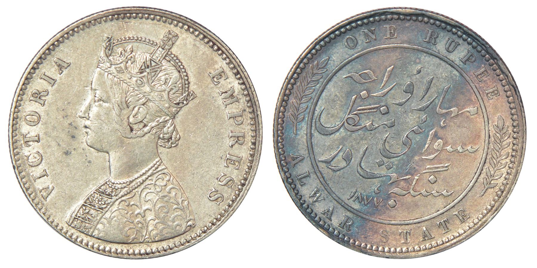 Alwar, Mangal Singh (1874-1892 AD), silver rupee, AD 1877, KM 45, 11.64g. Obv: Portrait bust of Victoria Empress. Rev: Persian legend Maharao Rajah Sawai Mangal Singh Bahadur.Partially toned,