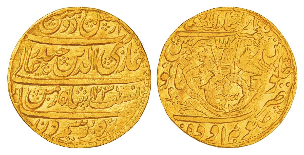 Awadh, Ghazi ud-Din Haidar (1819-1827 AD), gold ashrafi, Dar us-Sultanat Lakhnau Suba Awadh mint, AH 1236/RY 2, KM 170.2; M&D 7.28, 10.67g. Obv: Persian legend sikka zad bar seem wa zad az fazl rab zulmenan ghazi ud-din haidar ali nasab shah i-zaman. Rev: Crown flanked by rampant lions holding flag, two upright fish below; with Mint name and RY.