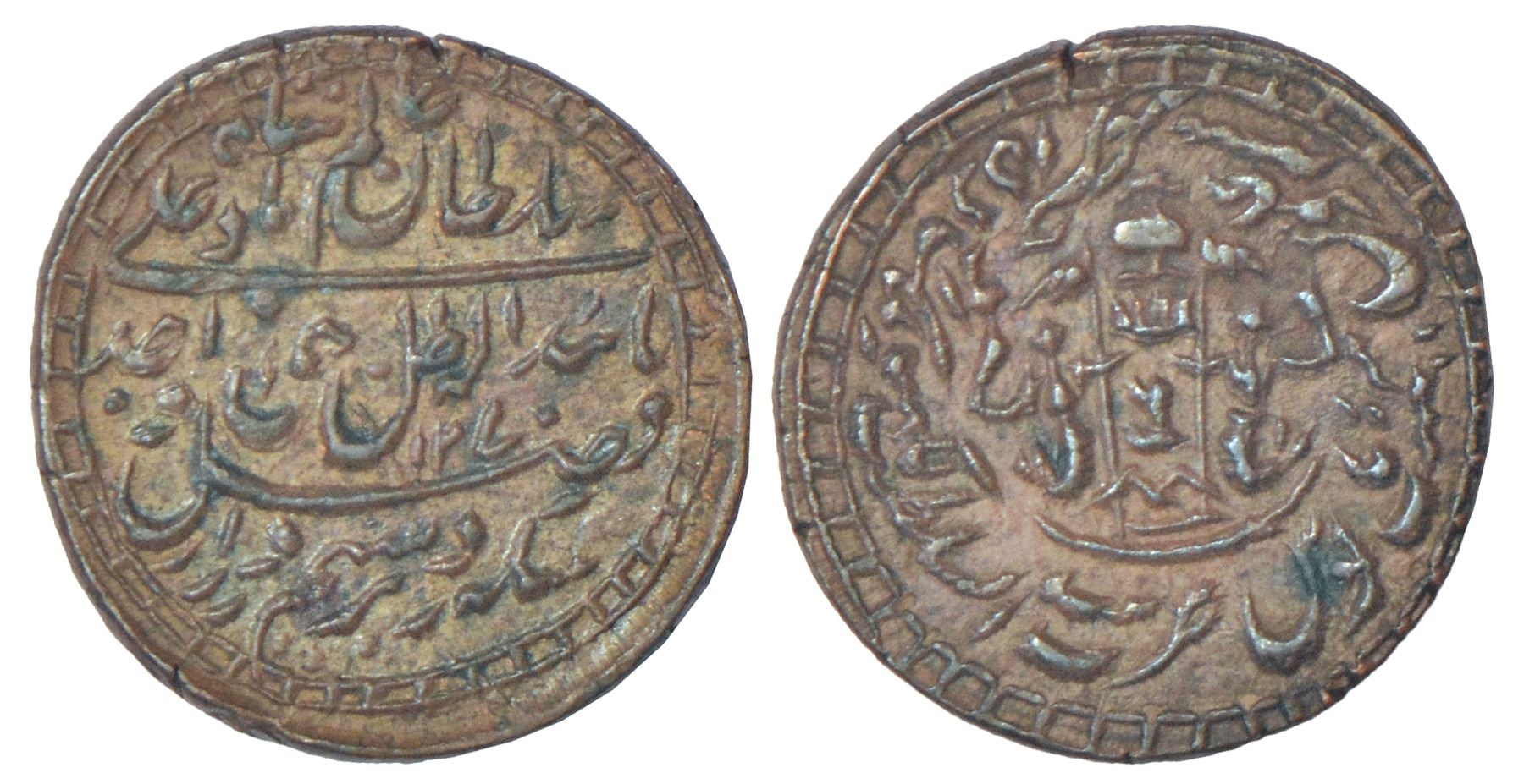 Awadh, Wajid Ali Shah (1847-1856 AD), copper ¼ paisa, AH1270/RY8, Bait al-Saltanat Lakhnau Mulk Awadh Akhtarnagar mint, 3.07g. Obv: Farsi couplet Sikka zad bar Seem wa Zar az Fazl wa Tayeed Alah/Zill Haq Sultan 'Alam Wajid Ali Badshah. Rev: Coat-of-arms with number '6' in centre, mint-name and RY details around.
