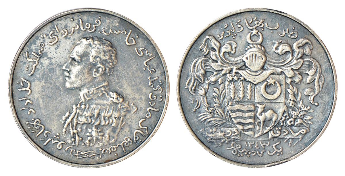 Princely States: Bahawalpur, Sir Sadiq Muhammad Khan V (1907-1947 AD), silver nazarana rupee, AH 1343, KM M10, 12.25g. Obv: Portrait bust of Muhammad Khan V. Rev: Coat of arms of Bahawalpur.