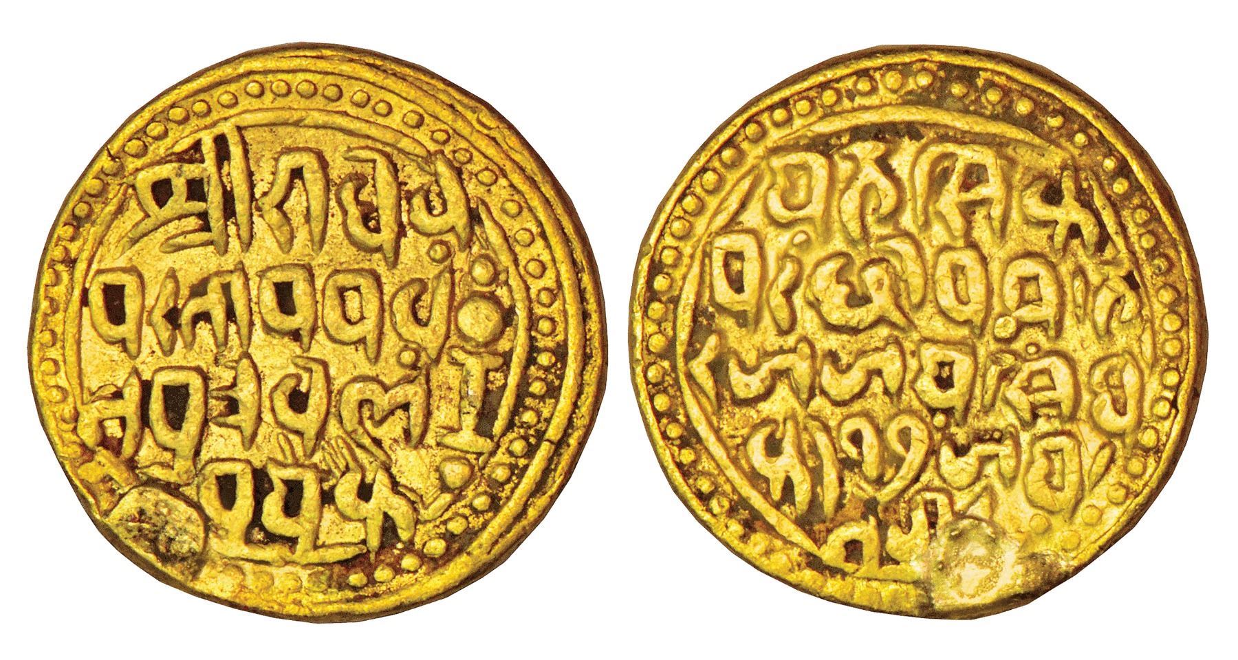 The gold coins of Bajranggarh are extremely rare, known to the cataloguer only by an octagonal piece offered at an international auction in 2007 and a round piece existing in the National Numismatic Collection of the USA. In all likelihood, they were struck only for ceremonial purposes. During the reign of Jai Singh, Bajranggarh became his principle residence as his family seat Raghogarh was threatened by the Sindhia. He issued coins of a remarkable design, bearing inscriptions only in Nagari and owing allegiance to no one except God Hanuman. Bajranggarh was sacked by the Sindhia's general Jean-Baptiste Filose in 1816 and Jai Singh had to live the last years of his life as a fugitive.