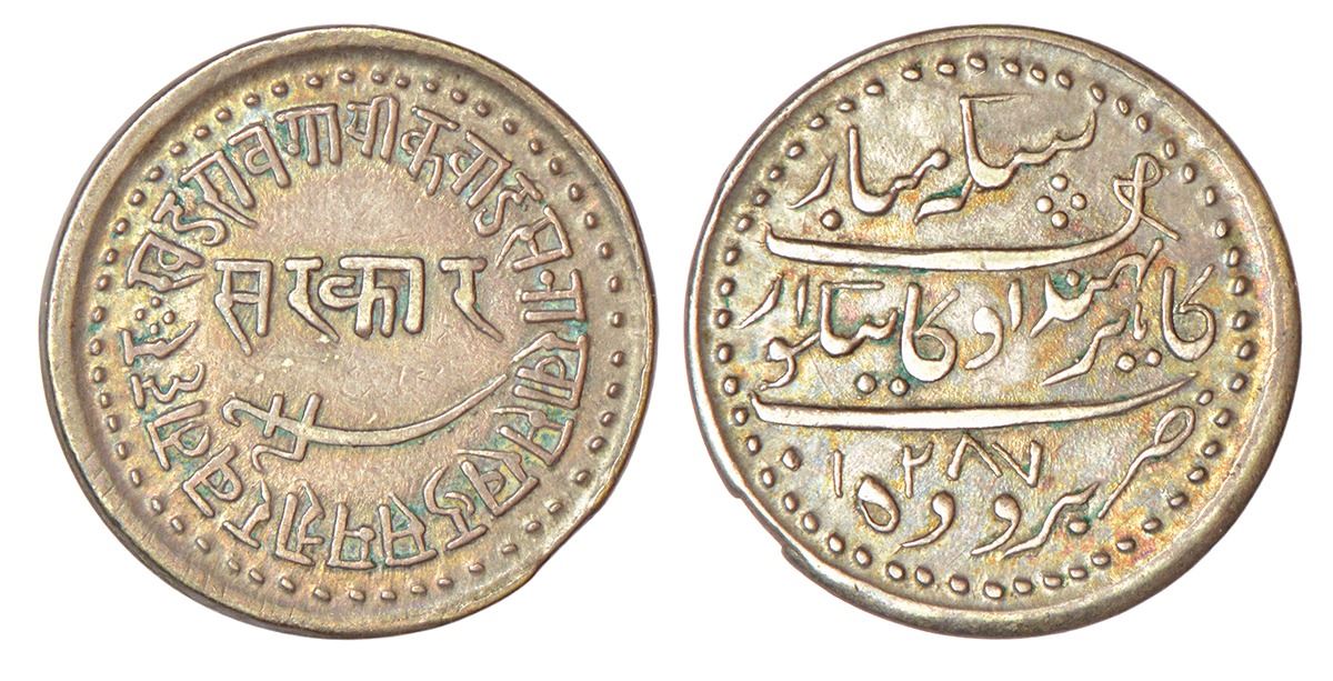 Princely States: Baroda, Khande Rao (1856-1870 AD), silver nazarana rupee, Baroda mint, AH 1287, misspelled version of Khande's name in Persian on reverse, KM Y14.1, 11.44g. (From the collection of Mr. I.K. Kejriwal)
