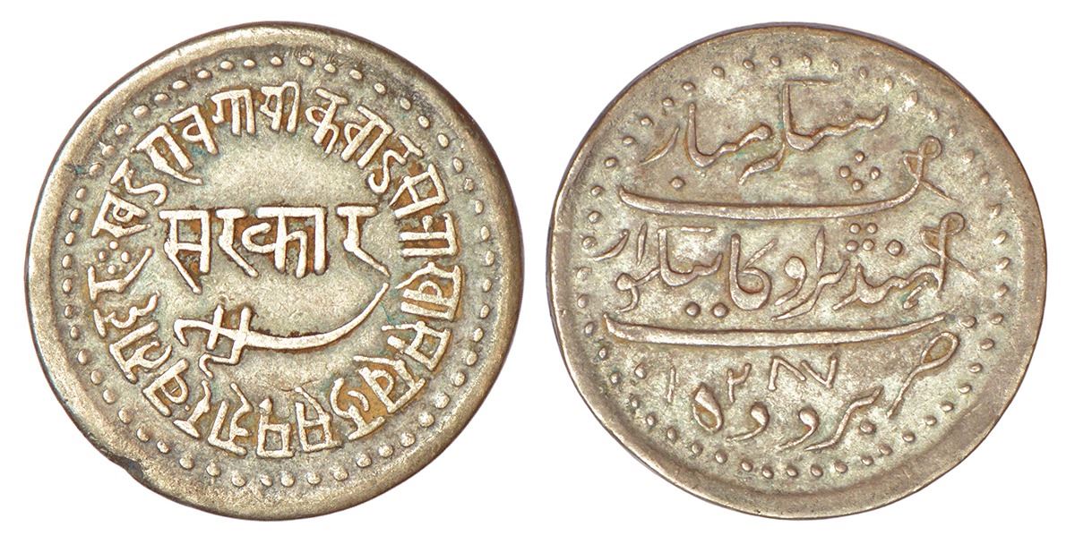 Princely States: Baroda, Khande Rao (1856-1870 AD), silver nazarana rupee, Baroda mint, AH 1287, correctly spelled version of Khande's name in Persian on reverse, KM Y14.2, 11.40g. (From the collection of Mr. I.K. Kejriwal)
