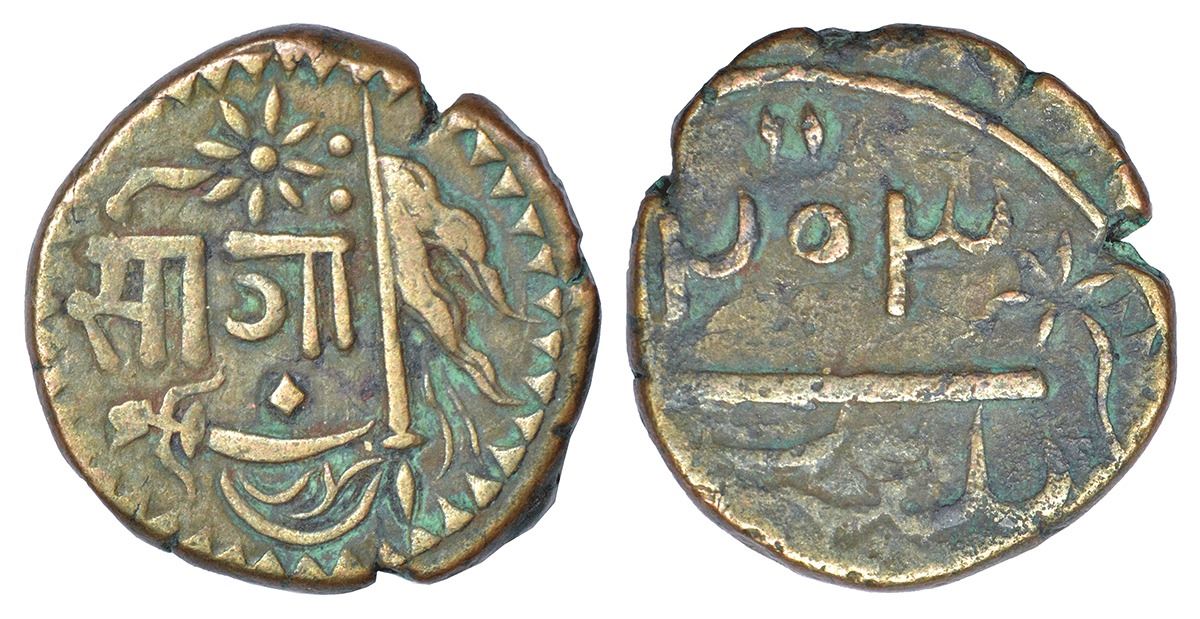 Baroda, Sayaji Rao II (1819-1847 AD), copper paisa, Amreli mint, AH 1253, KM C29.1, 7.08g. Obv: Devanagari letters 'Sa Ga' with horizontal sword and flower above, to the right Jari Pataka symbol (Maratha banner) flowing to right. Rev: Mint name and date.