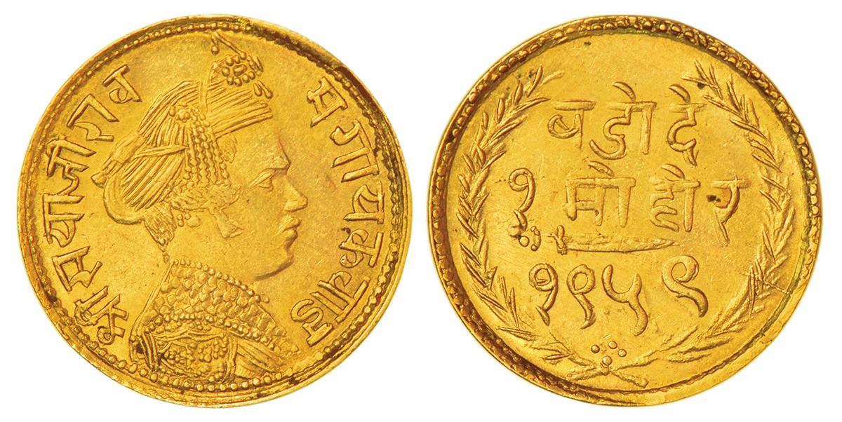Baroda, Sayaji Rao III (1875-1938 AD), gold mohur, VS 1959, KM Y39, 6.34g. Obv: Portrait bust of Sayaji Rao III. Rev: Denomination, scimitar and date within wreath.
