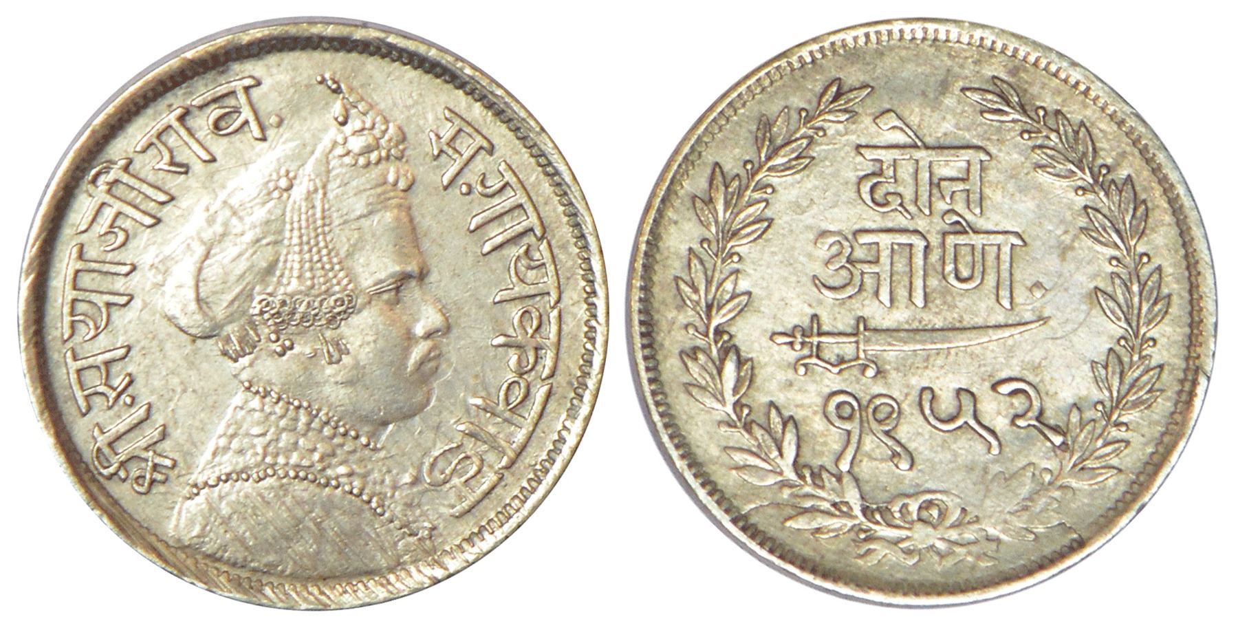 Baroda, Sayaji Rao III (1875-1938 AD), silver 2 anna, VS 1952, KM Y33a, 1.42g. Obv: Portrait bust of Sayaji Rao III. Rev: Denomination and date.