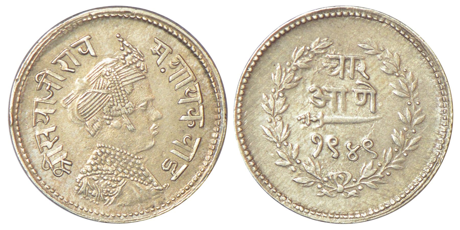 Baroda, Sayaji Rao III (1875-1938 AD), silver 4 anna, VS 1949, KM Y34, 2.84g. Obv: Portrait bust of Sayaji Rao III. Rev: Denomination and date.