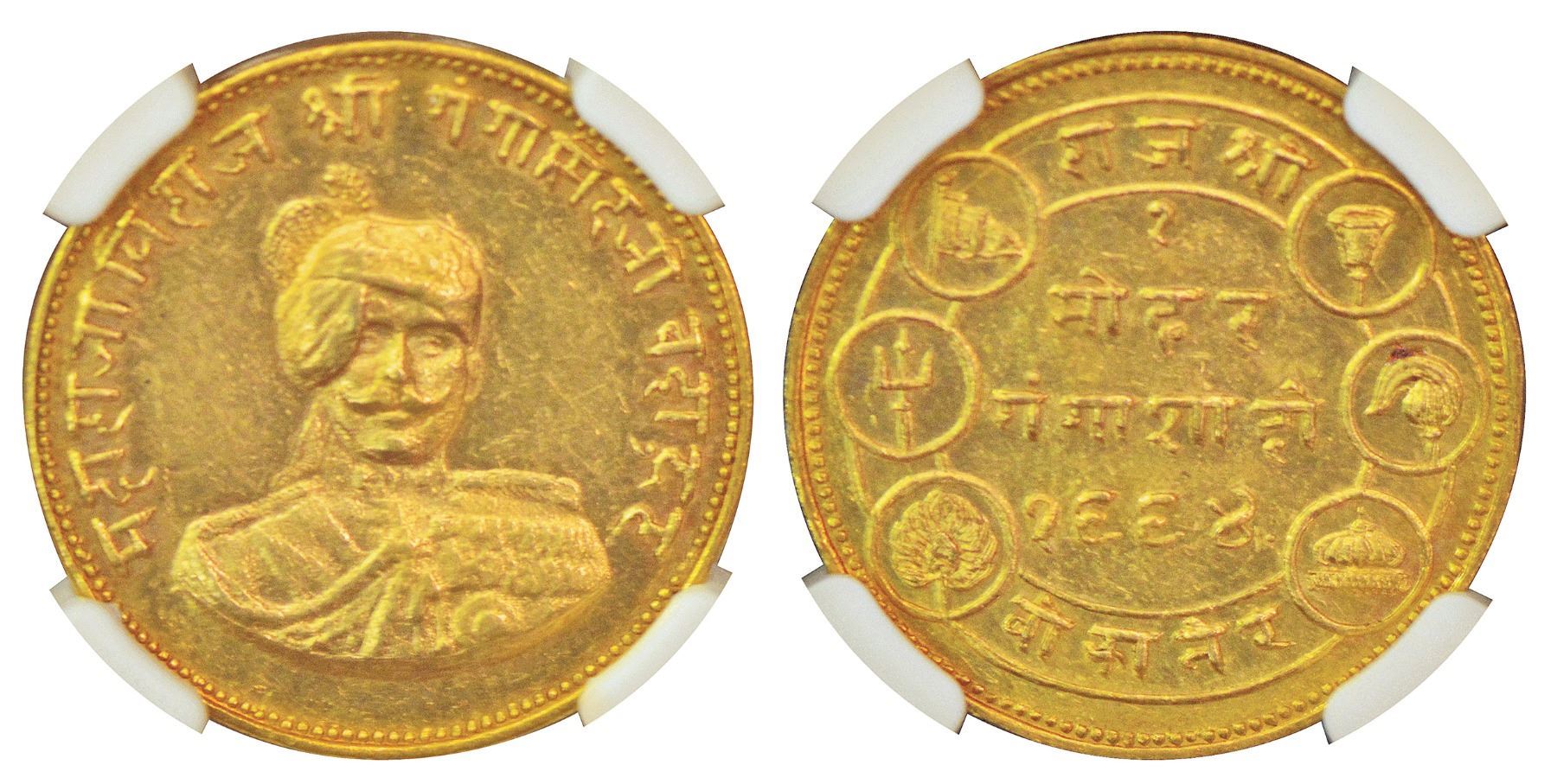 Bikanir, Ganga Singh (1887-1942 AD), gold nazarana mohur, issued on 50th anniversary of reign of Ganga Singhji, VS 1994, KM M3.