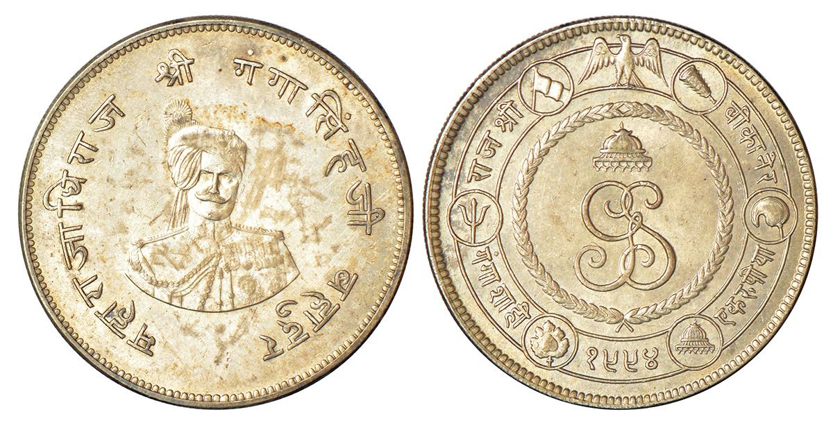 Princely States: Bikanir, Ganga Singh (1887-1942 AD), silver rupee, commemorative issue of the golden jubilee of the ruler's reign, VS 1994, KM XM1, 12.96g. Obv: Portrait bust of the king. Rev: Coat of arms of the state and VS date.