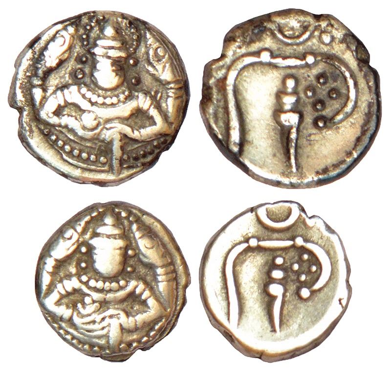 Princely States: Cochin, British Protectorate, silver coins (2), 1x 2 puttuns, KM 6, 1.07g and 1x puttun, KM 5, 0.53g, ND (1856-1858). Obv: Shiva facing front with a serpent on each side. Rev: A crescent above stylized design resembling conch shell. (2 coins)