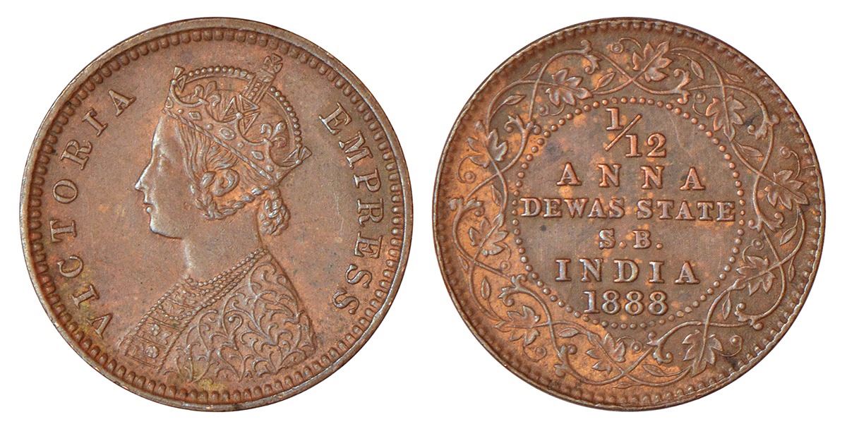 Princely States: Dewas, SB (senior branch), Krishnaji Rao (1860-1899 AD), copper 1/12 anna, 1888 AD,