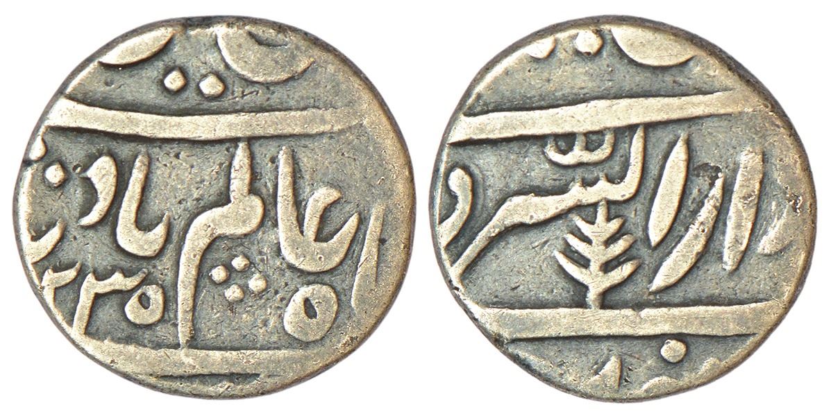 Gwalior, Daulat Rao (1794-1827 AD), silver ½ rupee, Dar us-Sarur Burhanpur mint, in the name of Shah Alam II, AH (1)235, sprig mint mark on reverse, KM B38, 5.61g.