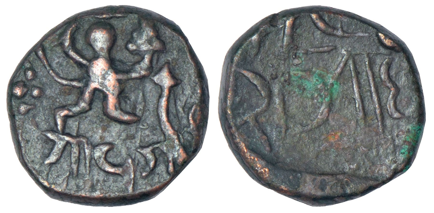 Gwalior, Daulat Rao Sindhia (1794-1827 AD), copper paisa, Rajod mint, KM 196, 11.65g. Obv: Hanuman facing right with dronagiri mountain and cobra at right. Rev: Devanagri legend Rajod and date partly visible.