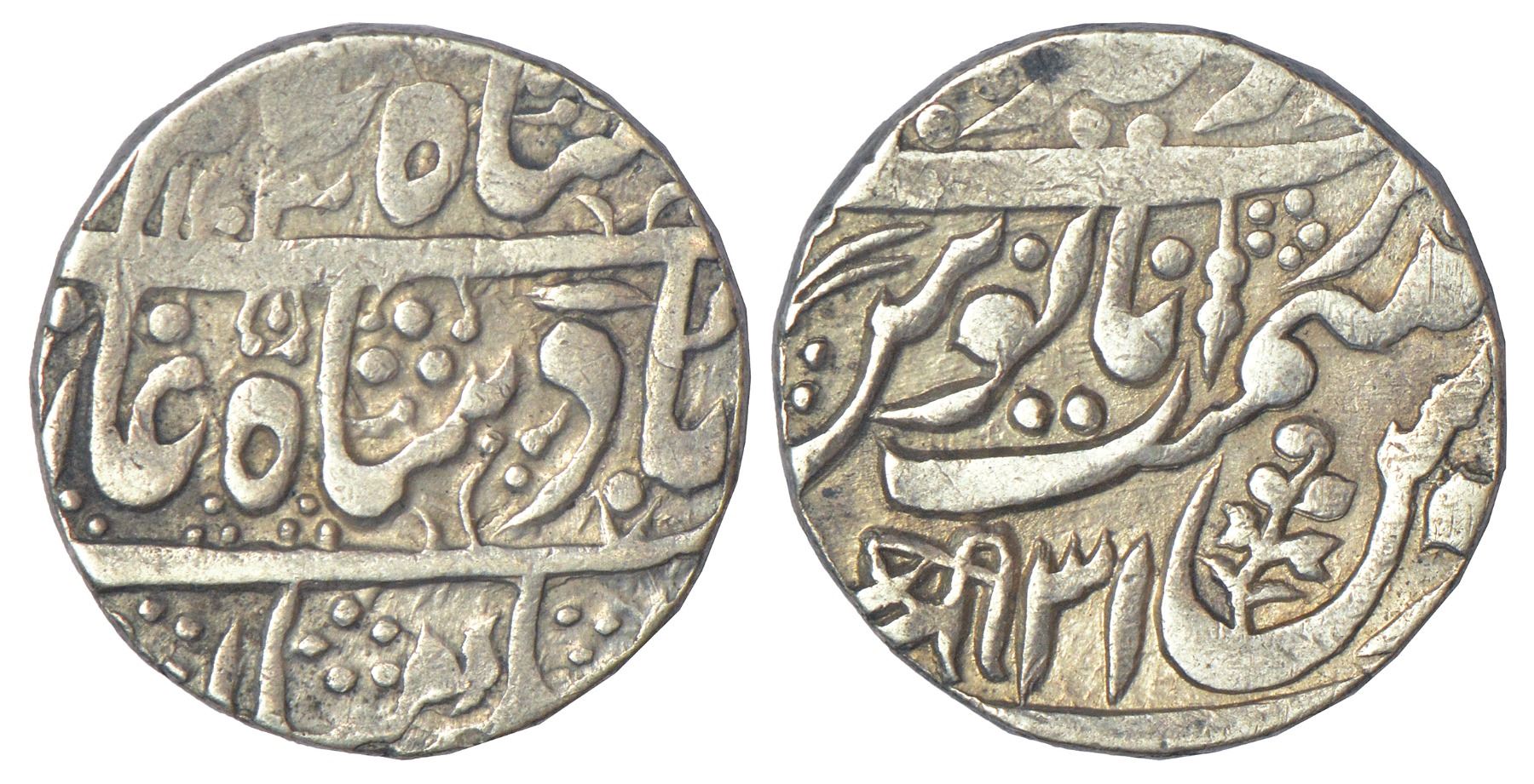 Gwalior, Daulat Rao Sindhia (1794-1827 AD), silver rupee, Ajmer mint, AH 1202/RY 31 (frozen), struck under the jurisdiction of Bapu Sindhia as governor, with 'Shri' and floral sprig as mint-marks on reverse, 10.89g.