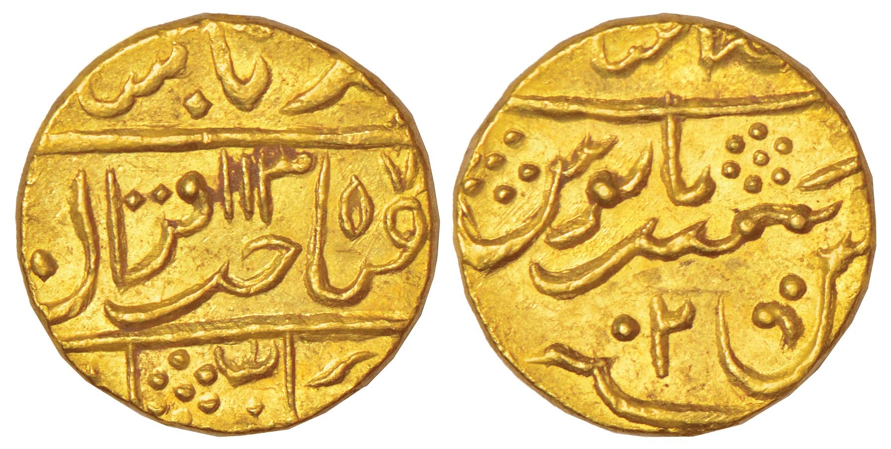 Gwalior, Jayaji Rao (1843-1886 AD), gold mohur, Lashkar mint, pseudo mint name Dar ul-Khilafat Shahjahanabad, in the name of Muhammad Shah, 'Sahib Qiran' coulet, AH 1135/RY 2, KM 114.