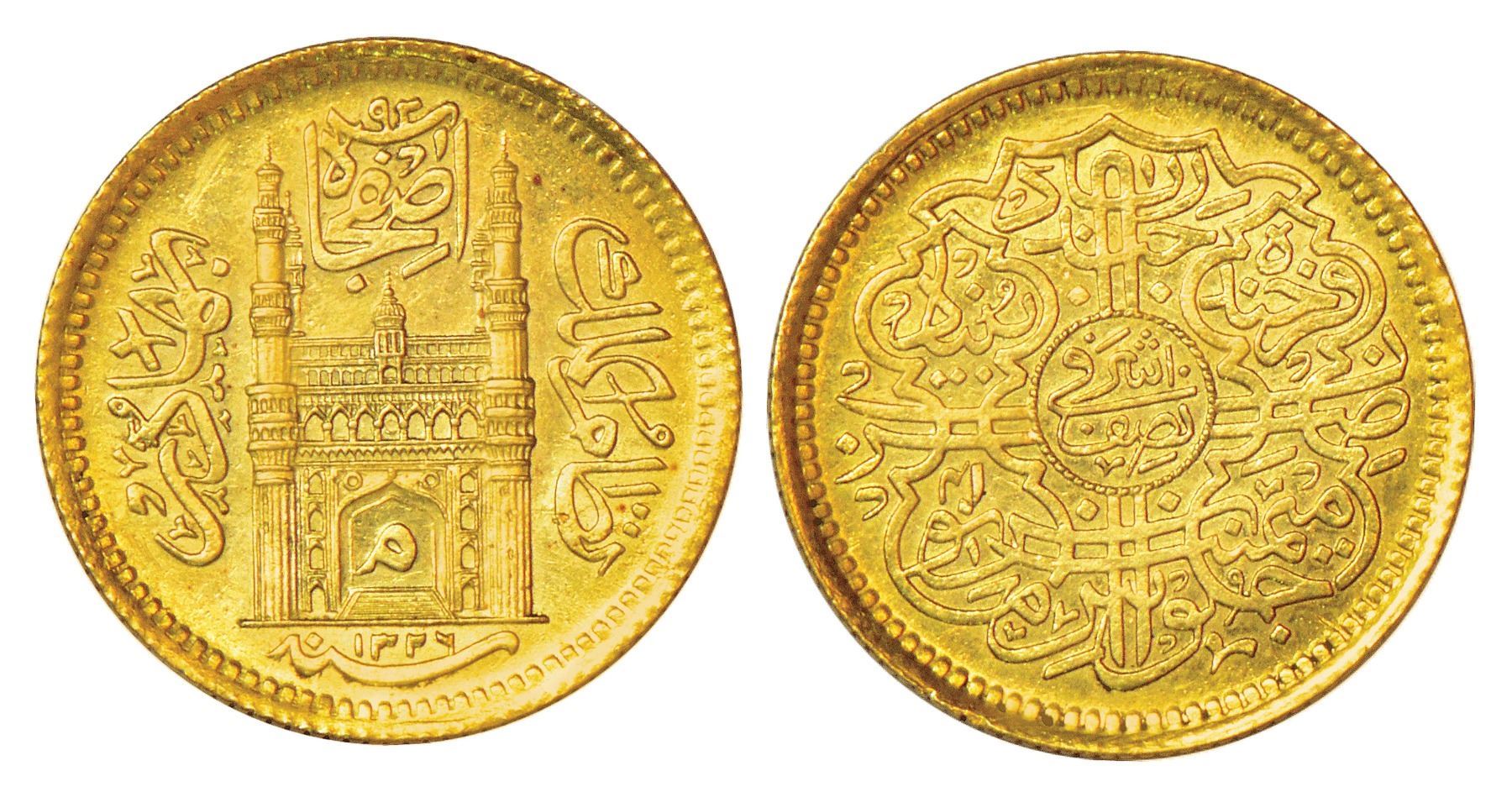 Hyderabad, Mir Mahbub Ali Khan (1869-1911 AD), gold ½ ashrafi, 5.56g, Hyderabad mint, AH 1326/RY 41, 'Mim' in door way of charminar, KM 43.1, mount mark on edge.