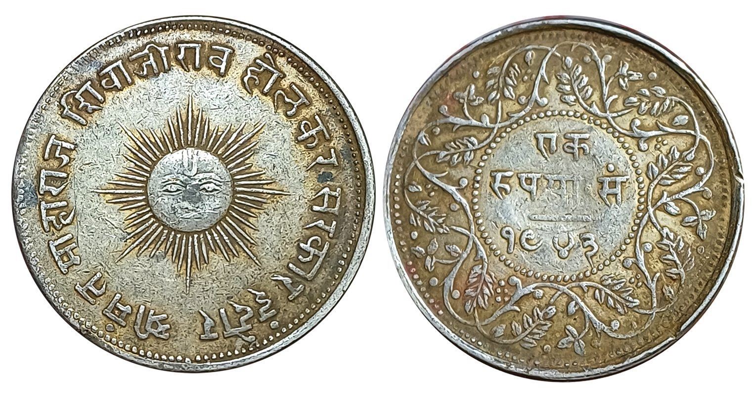 Shivaji Rao Holkar, Silver Machine-struck circulated Pattern Rupee, 11.65g, VS 1943, Obv: Sun face in centre, Devanagari legend “Shrimant Maharaja Shivaji Rao Holkar Sarkar Indore” around, Rev: Denomination and date in Devanagari within a floral border. About extremely fine, exceedingly rare.