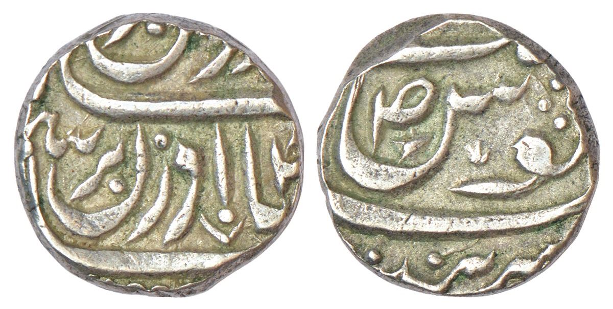 Princely States: Jind, Fateh Singh (1819-1822 AD), silver rupee, Sahrind mint, ND, in the name of the Ahmad Shah Durrani, 'Qadir Be -Chun' couplet, star symbol below 'Suaad' within the 'S' of Jalus and flower-like symbol between the 'U' and 'S' of Jalus on reverse, unlisted in KM, 10.97g.