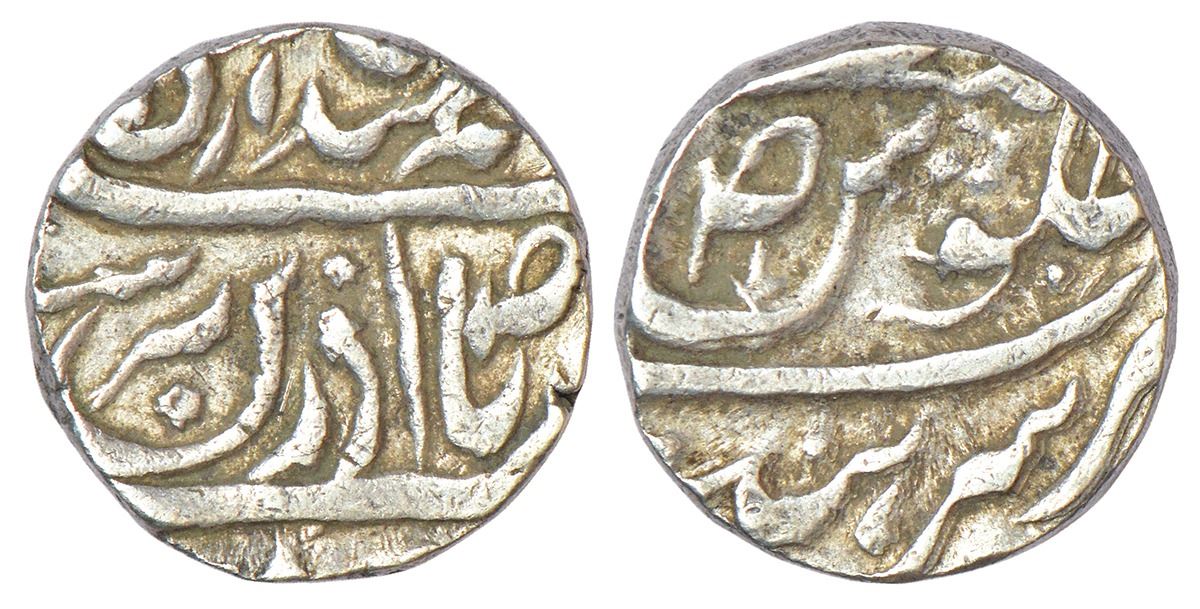 Princely States: Jind, Gajpat Singh (1764-1786 AD), silver rupee, Sahrind mint (fully visible), ND, in the name of the Ahmad Shah Durrani, 'Qadir Be-Chun' couplet, sprig (flower) symbol below 'Suaad' within the 'S' of Jalus on reverse, and lack of a symbol between the 'U' and 'S' of Jalus, KM 1, 10.97g.