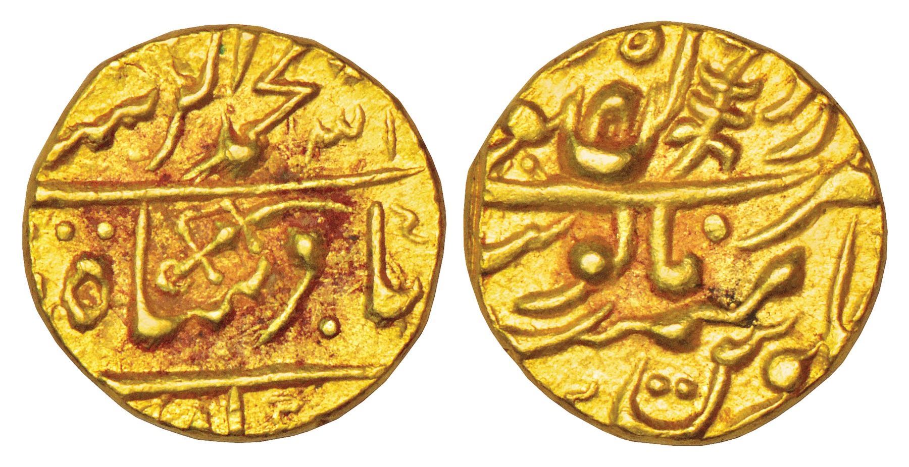 Jodhpur, mughal style, gold mohur, 10.96g, Dar ul-Mansur Jodhpur mint, in the name of Muhammad Akbar II, (1806-1837 AD), date (12)31, Sword mintmark on obverse, Lingen M&J 04.01, type 3.