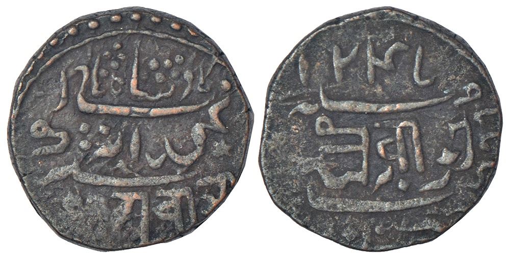 Junagadh, Bahadur Khan (1811-1840 AD), copper dokdo, in the name of Muhammad Akbar II, AH 1247/AD 1889, KM 11, 7.29g.