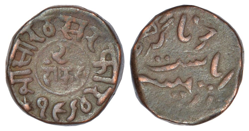 Junagadh, Rasul Muhammad Khan (1891-1911 AD), copper 2 dokdo, VS 1964, KM 48, 5.66g. Obv: Two dokdo in inner circle surrounded by Devanagari legend Shri Sorath Sarkar & 1964. Rev: Arabic legend Junagadh Riyasat and value.