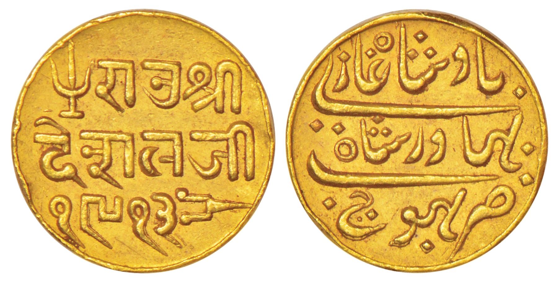 Kutch, Deshalji II/Bahadur Shah II (1819-1860 AD), gold 25 kori, VS 1913, Kutchi 3 in date, DR-K-162.3, 4.67g.