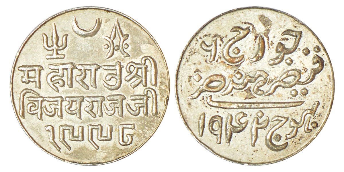 Probably the rarest of the all coins of Kutch of modern times, this is most likely a 'presentation' strike, issued at or soon after the coronation of the Maharao in 1942. Unusually it follows a design that was discontinued in 1927, during the reign of Maharao Khengarji III, the father of Vijayrajji. Dilip Rajgor, in 'Standard Catalogue of Coins of Kutch State' mentions that only twentyfive pieces were struck to present to the dignitaries and they received the coin when the new Maharao visited the mint soon after the coronation ceremony. He also mentions that they are struck from 're-engraved dies' of Khengarji III's coins; however, the coin itself does not show any signs of such re-engraving.