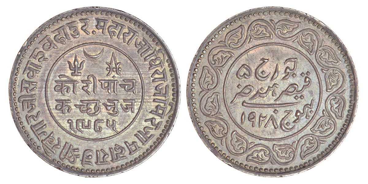 Only silver 5 koris dated VS 1985/AD 1928 has legend KUTCH STATE BHUJ on edge. Due to the opposition from the British, the word STATE was deleted later.