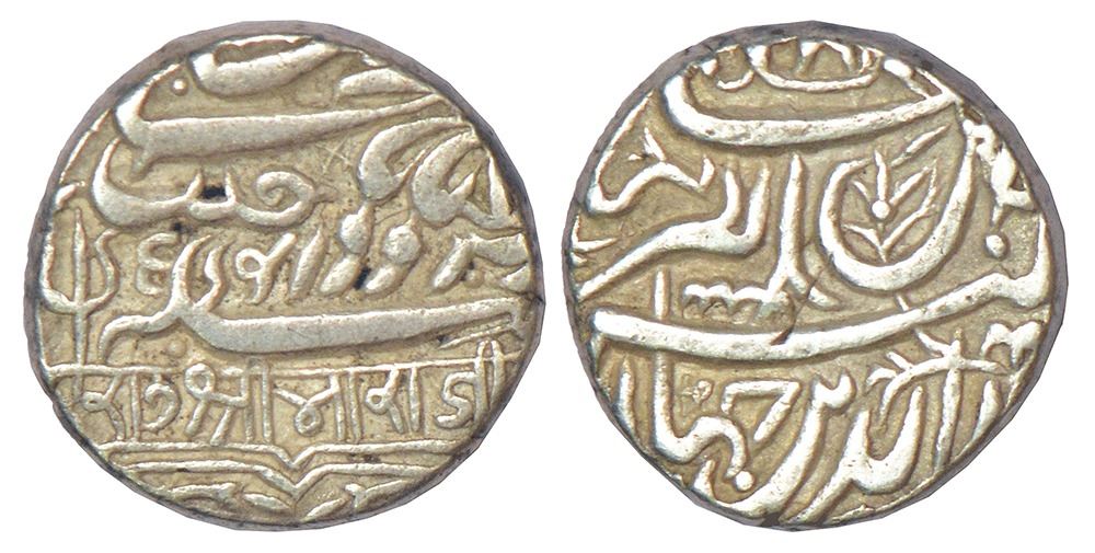 Kutch, Rao Bharmalji I (1586-1632 AD), silver kori, with the name of Mughal Emperor Jahangir, Devanagari 'Ji' in Bharaji, DR-K 28.1, 5.59g. Obv: Farsi legend Sikka zad dar Jahan Khusroo Giti Sitan with trident and Devanagari legend Rau Shri Bharaji at the bottom. Rev: Farsi legend Shah Noor al-Din Jahangir ibn Akbar Badshah.