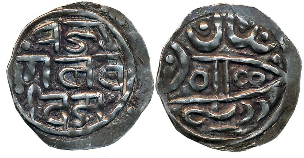 Gulab Singh, Silver Ja'u, 1.90g, Obv: Devanagari legend “Raja Gulab Singh” in three lines within dotted border, Rev: Figure 8 on side of Katar pointing right with crude legend “Zarb Tibat Kalan” (KM# 7.3). Extremely fine for type, rare.