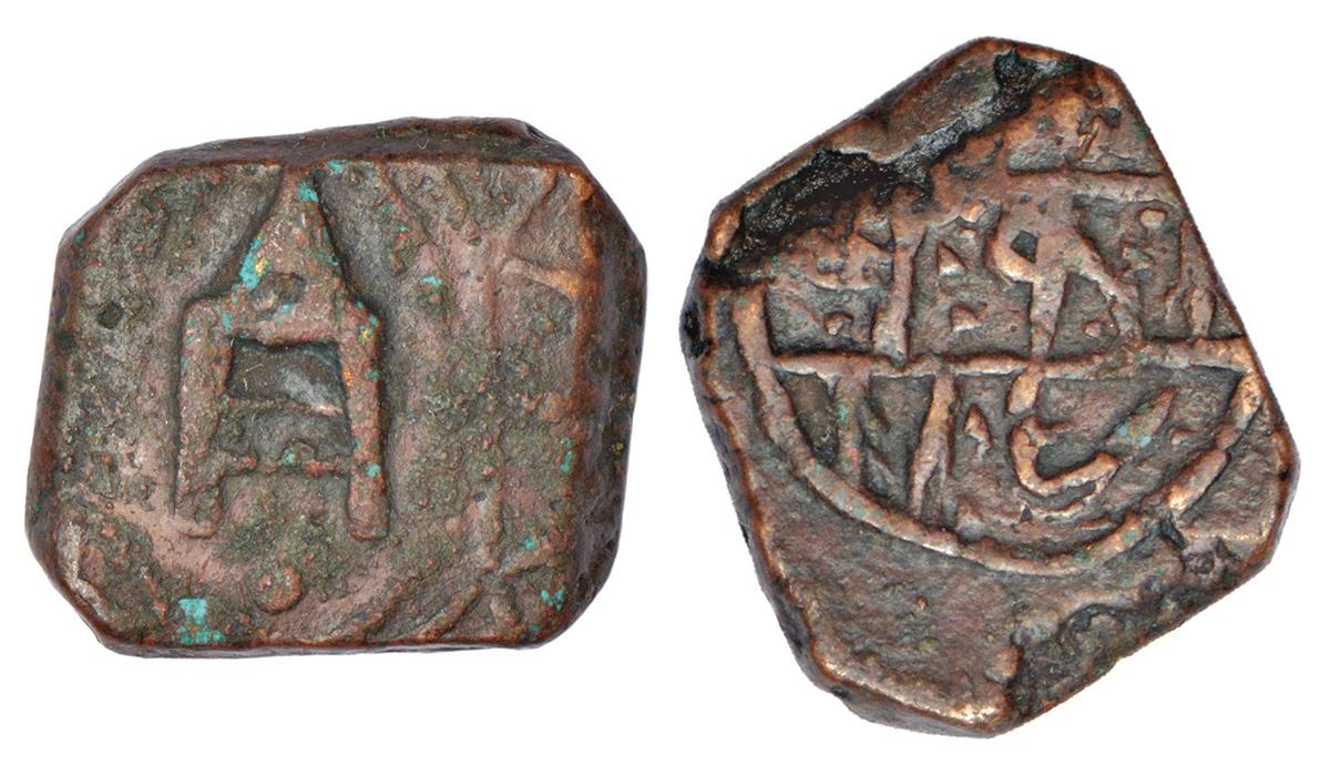 Princely States: Makrai, Raja Bharat Shah (1886-1920 AD), copper square paisa, KM 2, 10.20g. Obv: Dagger. Rev: Nagari legend Makrai.