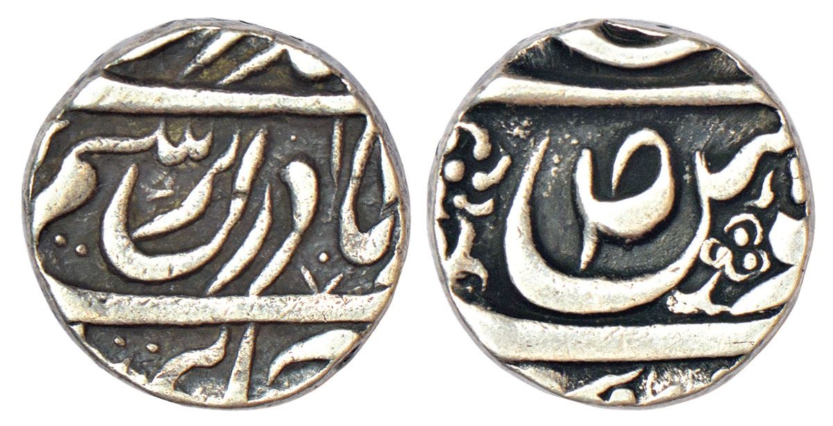 Princely States: Maler Kotla, Wazir Khan (1809-1821 AD), silver rupee, Sahrind mint, ND, in the name of Ahmad Shah Durrani, 'whirling flower-on curved stem' symbol to left of Jalus on reverse, unlisted in KM, 10.97g.