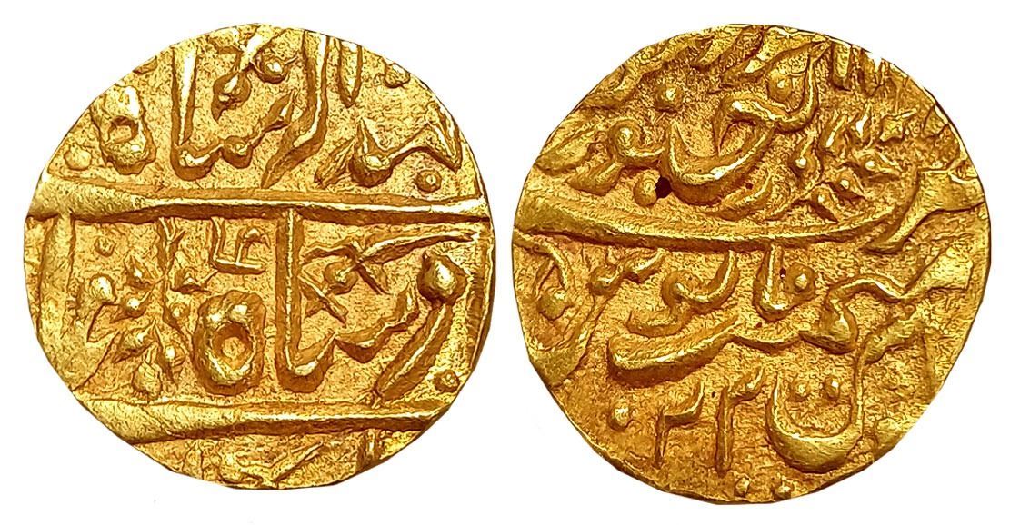 Jodhpur, Man Singh, Gold Mohur, 11.01g, Dar al-Mansur Jodhpur Mint, in the name of Muhammad Akbar II, fictitious RY 22, with inverted letter “Ga”, a sword and a jhar symbol on obverse and another jhar symbol in the top line on reverse (Lingen# J.04.04). Deep bold strike. About uncirculated, very rare.