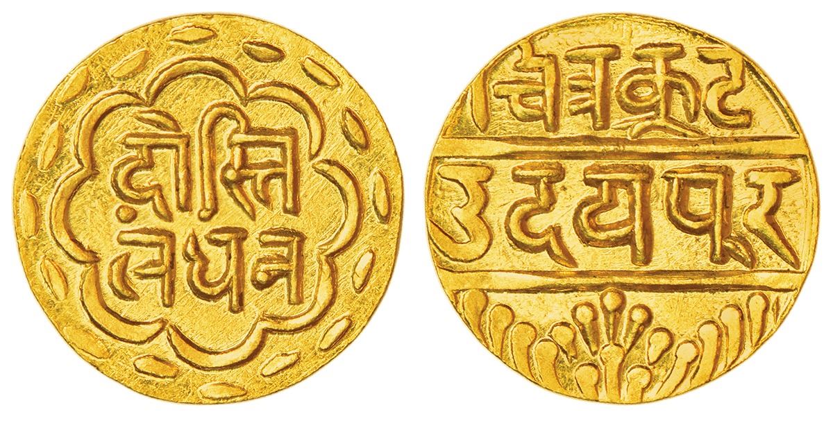 Mewar-Udaipur, Swarup shahi series, gold mohur, struck at Udaipur mint, ND (1858-1920 AD), KM YC12, 10.88g. Obv: Nagari legend Dosti/Landhan (Friendship with London). Rev: Nagari legend Chitrakot/Udaipur.