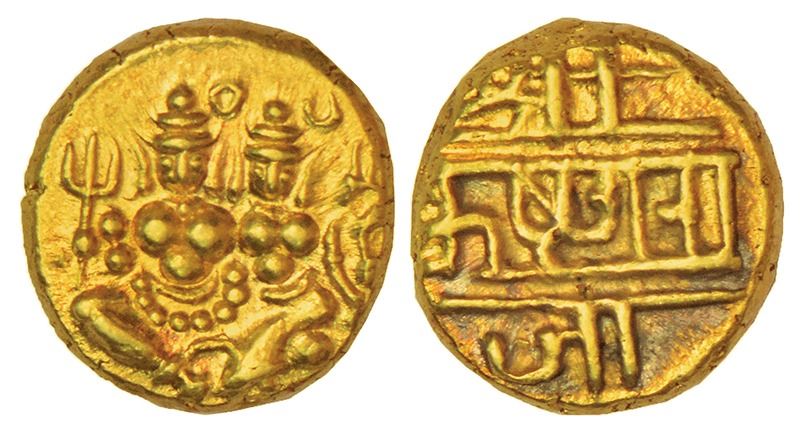 Princely States: Mysore, Krishnaraja Wodeyar (1799-1868 AD), gold pagoda, KM C210, 3.42g. Obv: Shiva Parvati seated. Rev: Devanagari legend Sri Krishna Raja in three lines.