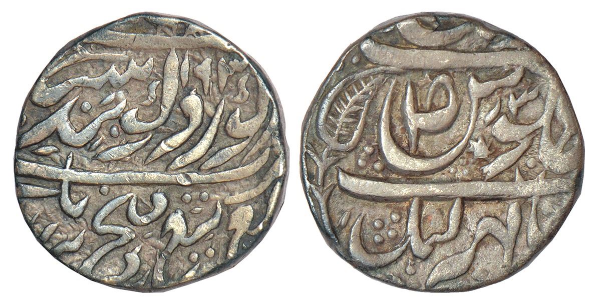 Princely States: Nabha - silver 'Nazarana' rupee of Hira Singh (1871-1911 AD), 'Nābh Kamal' mint, VS 193X/ RY3, struck on a much larger flan than usual, not listed in Herrli, 10.92g, 21.73mm. Obv: 'Gobindshahi' couplet: deg tegh fateh nusrat be-dirang yaft az nanak guru Gobind singh (Abundance, power and victory [and] assistance without delay, are the gift of Nanak [and] Guru Gobind Singh). Rev: 'Julus' formula with letter 'Suad' in the Seen of Julus, and a beautiful leaf mark to left in second line. (From the collection of Mr. I.K. Kejriwal)