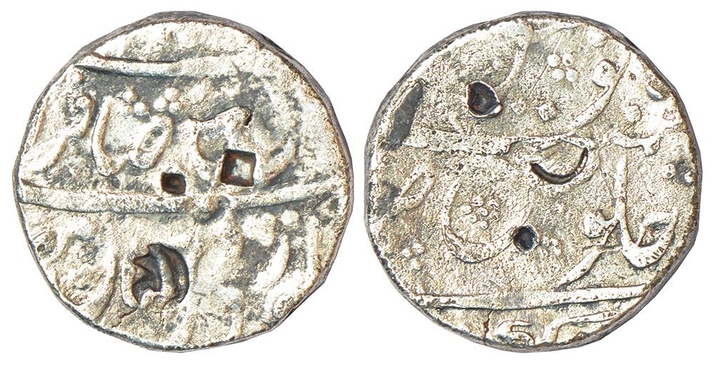 Nizams of Hyderabad - silver Chulnee rupee, Medak mint (partly seen), in the name of Alamgir II, unpublished in KM, 11.02g. Obv: Persian couplet Sikka zad dar Jahan chu Mihr Muneer/Sahib Qiran Thani Badshah Alamgir visible in parts. Rev: Formulaic 'Julus' legend with AH date next to 'Julus' and mint-name in the last line.