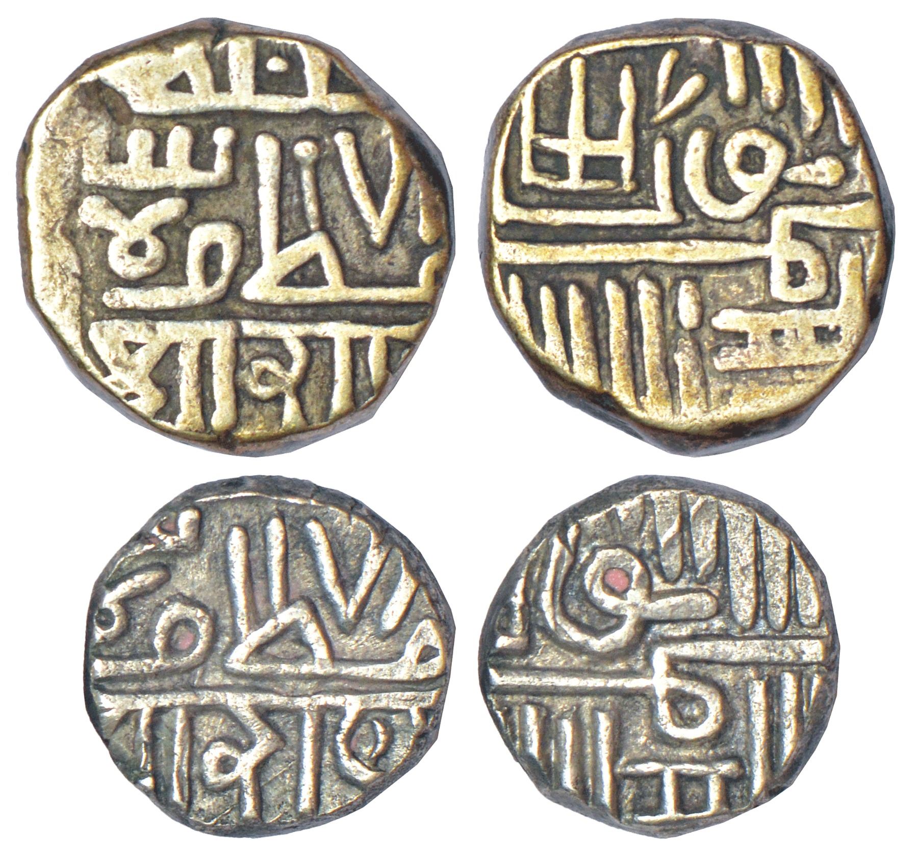 Porbandar (2), British protectorate, silver kori, KM 38, 4.88g and ½ kori, KM 37, 2.37g, with the name of Muzaffar Shah of Gujarat Sultanate, AH 978 (frozen), Devanagari 'Rana' at bottom on obverse. (2 coins)