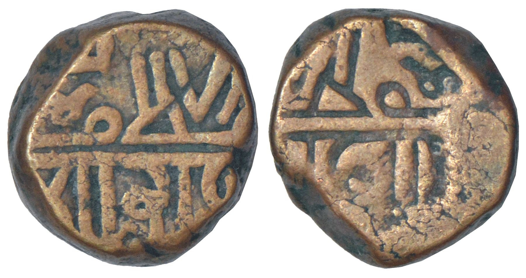 Porbandar, British Preotectorate, copper dokdo, 7.86g, with devanagari legend 'Rana' obverse brockage (lakhi) showing retrograde impression on reverse.