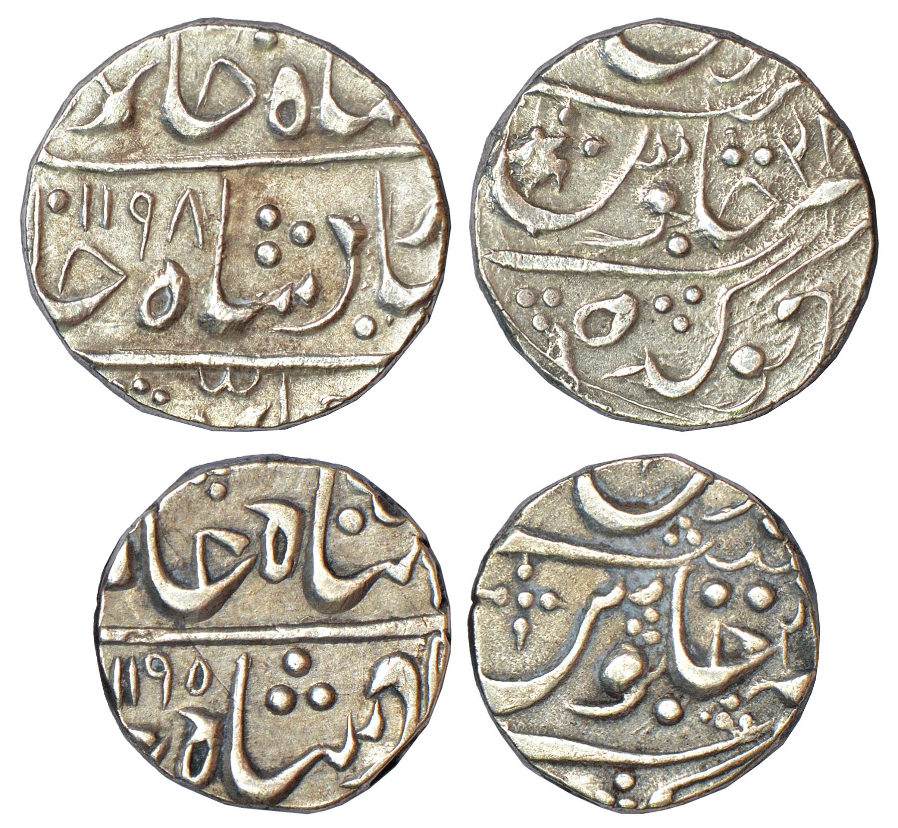Pratabgarh, Sawant Singh (1775-1825 AD), silver rupee, AH 1198/2x, KM 3, 10.93g and ½ rupee, AH 1195/RY 22, KM 2, 5.49g, Devgadh mint, in the name of Shah Alam II. (2 coins)