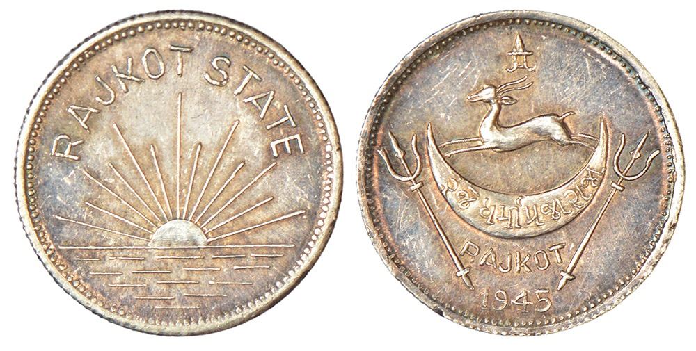 Rajkot, Dharmendra Singhji (1930-1948 AD), silver mohur, VS 1945, KM X1a, 5.83g. Obv: Legend 'Rajkot State' above rising sun. Rev: Coat of arms of state with date below.