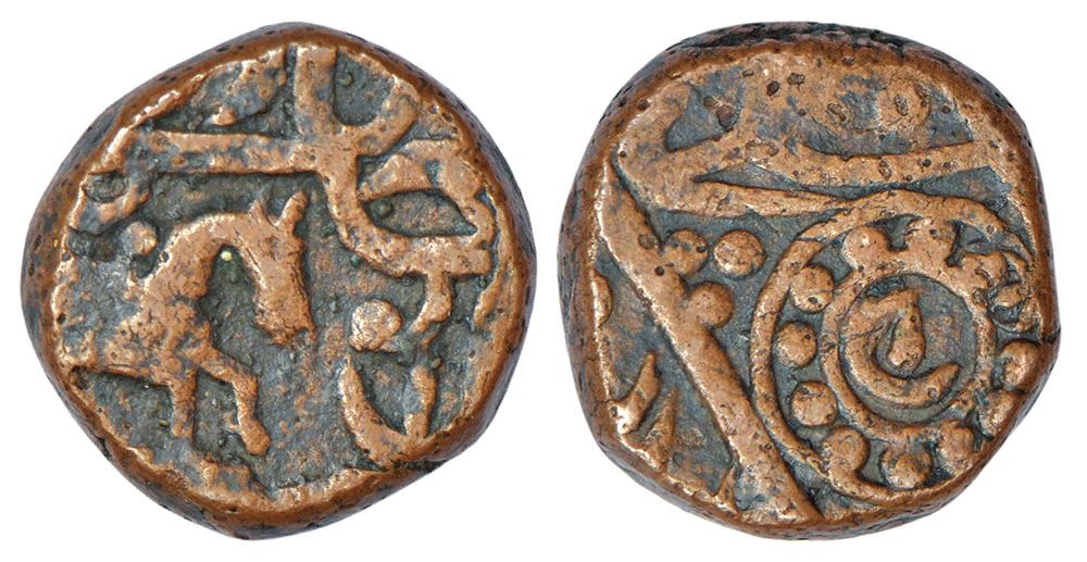 Ratlam, anonymous hammered coinage, 'Raij' series, copper paisa, 10.60g. Obv: Horse walking to right. Rev: Raij in dotted circle.