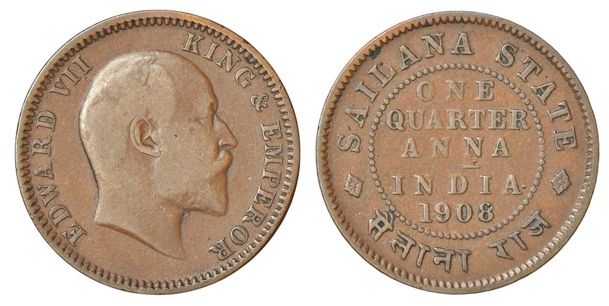 Princely States: Sailana, Jaswant Singh (1890-1919 AD), copper ¼ anna, AD 1908, KM 15, 4.82g. Obv: Portrait bust of Edward VII. Rev: State name, denomination and date.