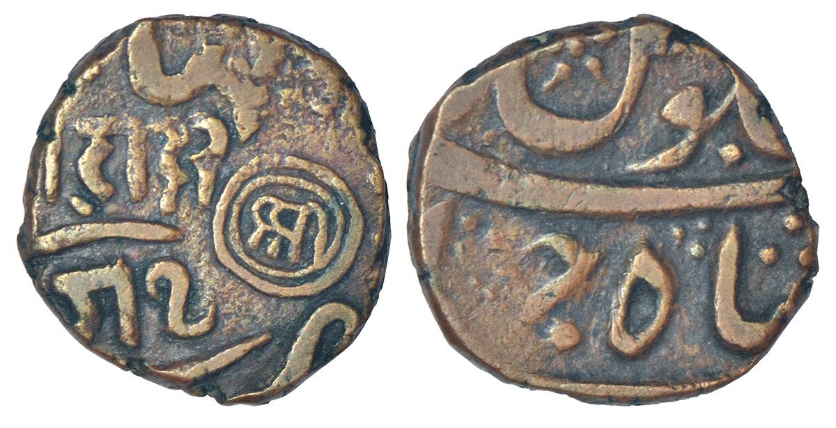 Thakurs of Bhavnagar, Mughal coinage, copper dokdo, in the name of Shah Jahan III, with Devanagari legend Bahadur and Shri in double circle on obverse, KM C15a, 4.84g.