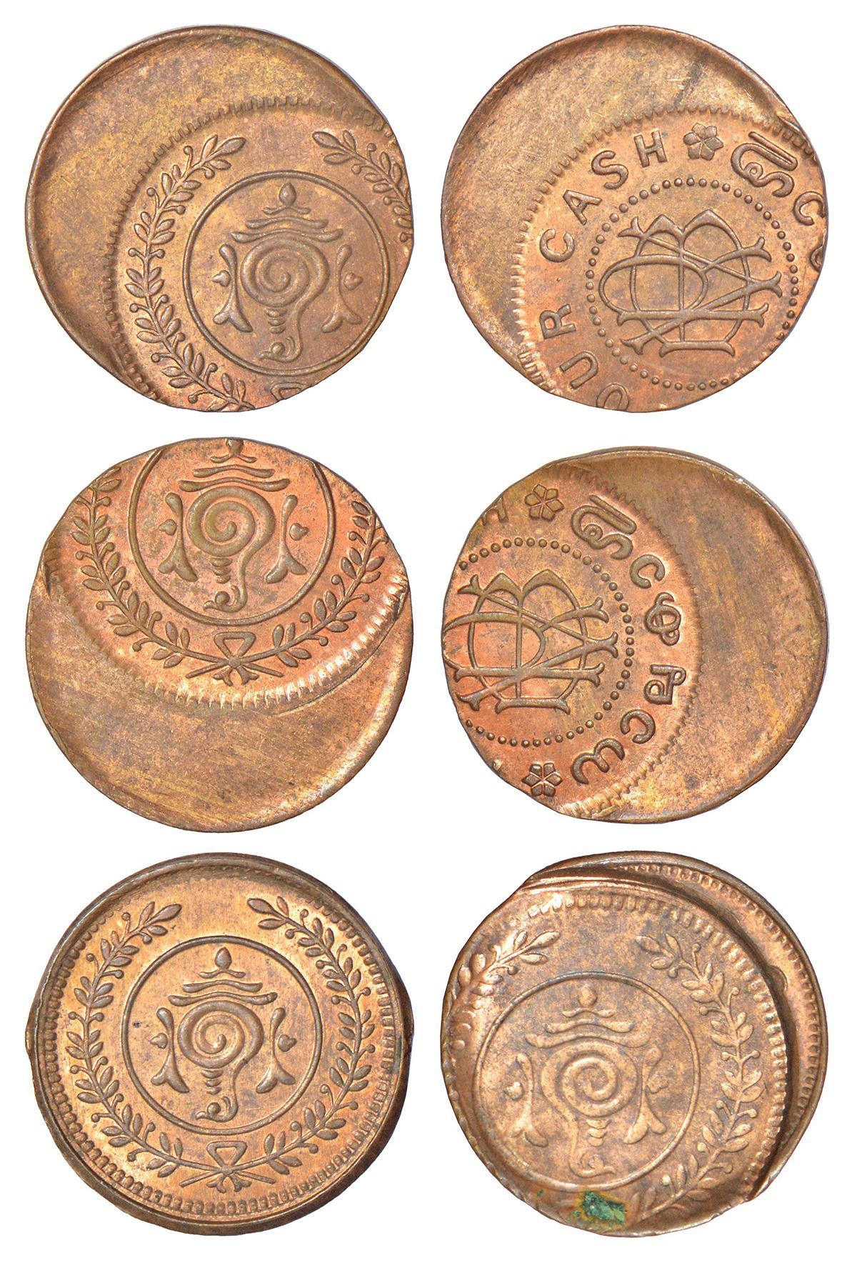 Princely States: Travancore, Bala Rama Varma II (1924-1949 AD), error, copper 4 cash (3), 2x Die-shifted on both sides and 1x Lakhi impression with die-shift. (3 coins)