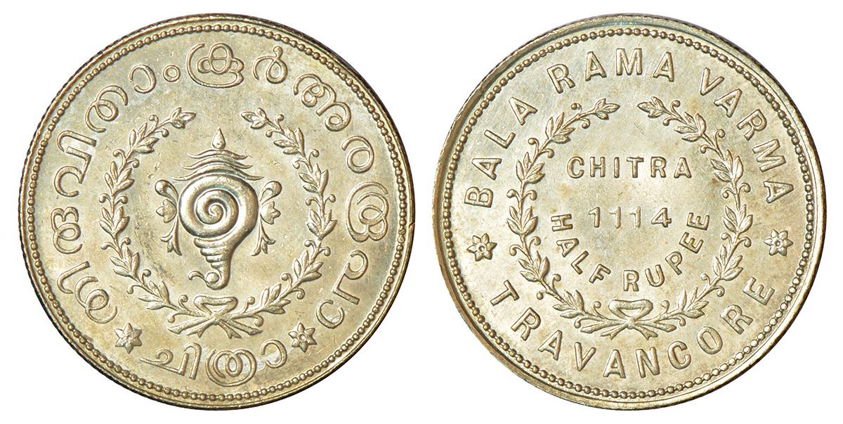 Princely States: Travancore, Bala Rama Varma II (1924-1949 AD), silver ½ chitra rupee, ME 1114, initial B.R.V engraved on edge, KM 64, 5.35g. Obv: Sankha in sprays. Rev: Value and date in sprays.